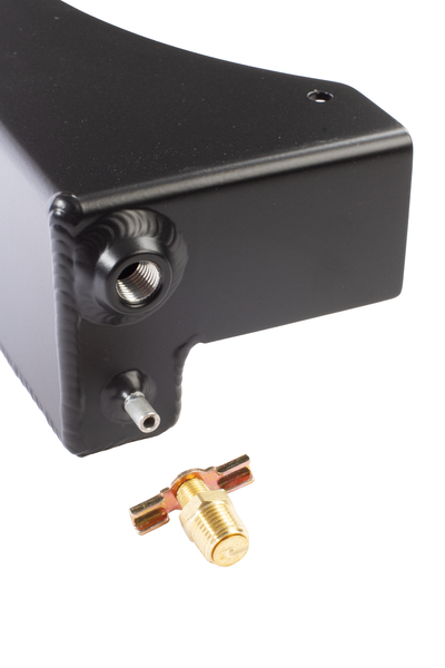 We have spent a lot of time making sure that this overflow tank truly works as it needs to. Inside of our tank are two independent aluminum straws. The -4AN male fitting on top of the tank is the main overflow input and will connect to your radiator. That input fitting extends to the bottom of the tank allowing the radiator to pull coolant back into the radiator. The small ¼” tube that extends from the bottom is the overflow. That tube runs up toward the top of the tank. So if you are not paying attention to the level, it will overflow when it reaches capacity. On the bottom of the tank is a petcock drain in the case that it needs to be emptied.