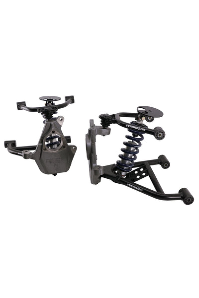 - The Upper StrongArms feature corrected ball joint angles for the lowered ride height and the length has been altered to create more camber adjustment. Injection-molded Delrin bushings with 13% Teflon are used to reduce deflection and stiction. The Lower StrongArms feature a double sheer lower shock mount for increased strength. We have also dropped the lower shock mount to increase suspension travel and altered the length to create more camber adjustment. Injection-molded Delrin bushings with 13% Teflon are used to reduce deflection and stiction.
